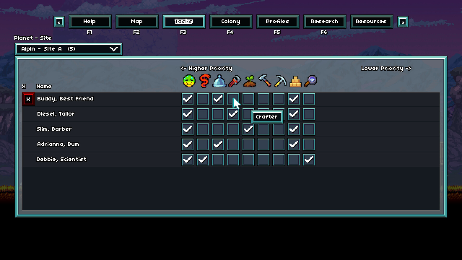 Автоматизируйте свои задачи и сколотите команду. Даже здесь, на далёкой планете, вы не одиноки. Примите других колонистов к себе и постройте базу вместе. У каждого есть свои уникальные характеристики, преимущества и недостатки, которым найдётся применение. С каждым выполненным поручением они будут повышать свой уровень и становиться умнее, сильнее и быстрее. Что самое приятное, им можно поручать всю грязную работу и распределять задачи с учётом способностей каждого. Устали добывать ресурсы и теперь хотите заняться инопланетным подземным гнездом? Пусть колонисты разберутся со всем за вас!