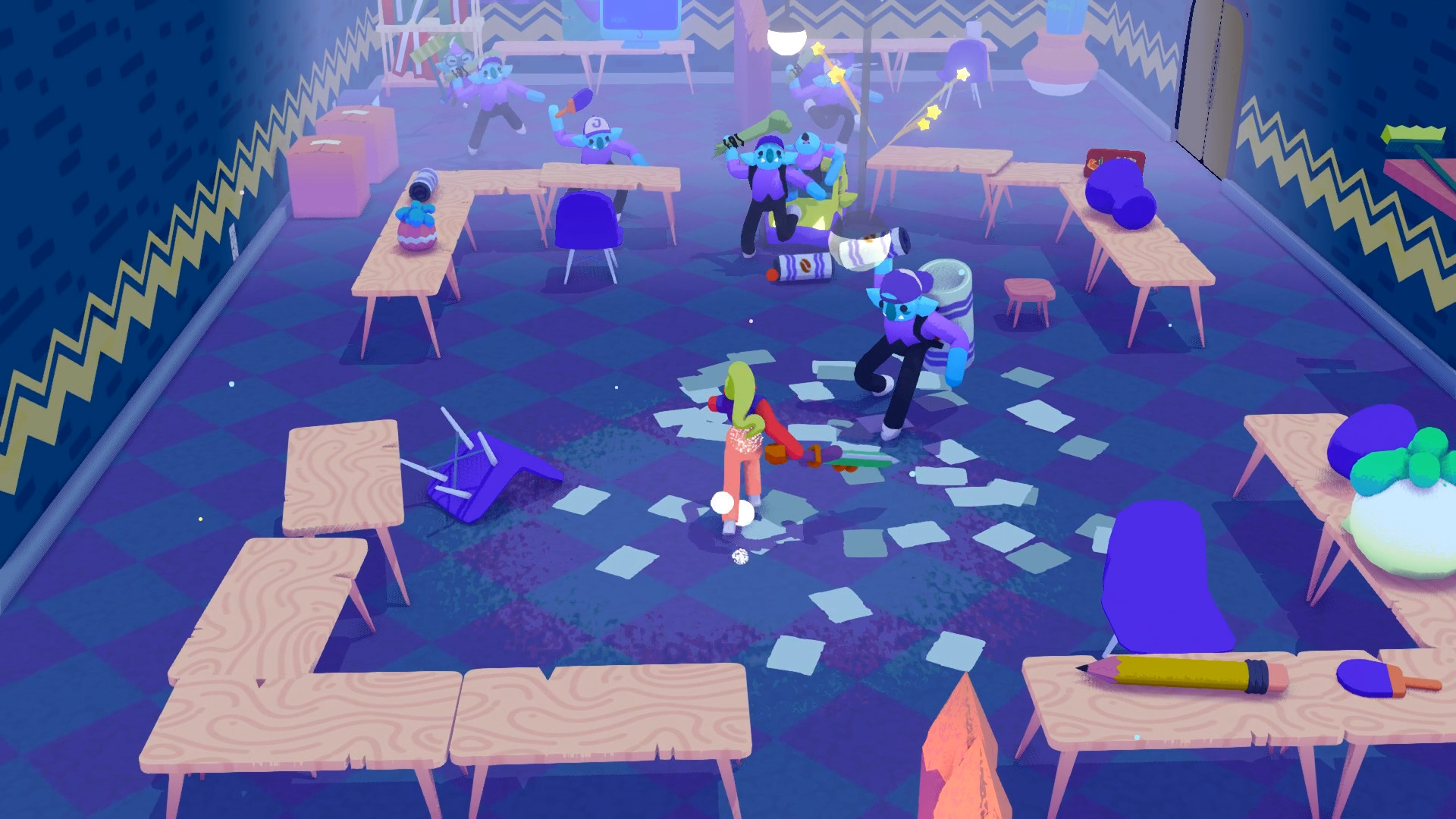 [Гибкость системы боев] В подземельях игры Going Under в качестве оружия можно использовать что угодно: ноутбуки, метлы или огромные подушки. Нормальное оружие здесь тоже водится, но оно может сломаться в самый неподходящий момент, если вы будете неосторожны. Играйте осторожно и выбирайте подходящее оружие для каждой ситуации, если хотите пережить испытательный срок.